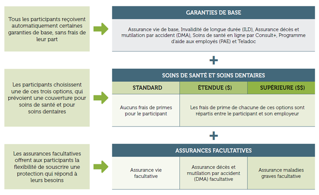 Tous les participants ont accès à des garanties de base pour l’invalidité de longue durée (ILD), l’assurance décès et mutilation accidentels (DMA), les soins de santé en ligne par Consult+, le Programme d’aide aux employés (PAE) et le programme Best Doctors.
